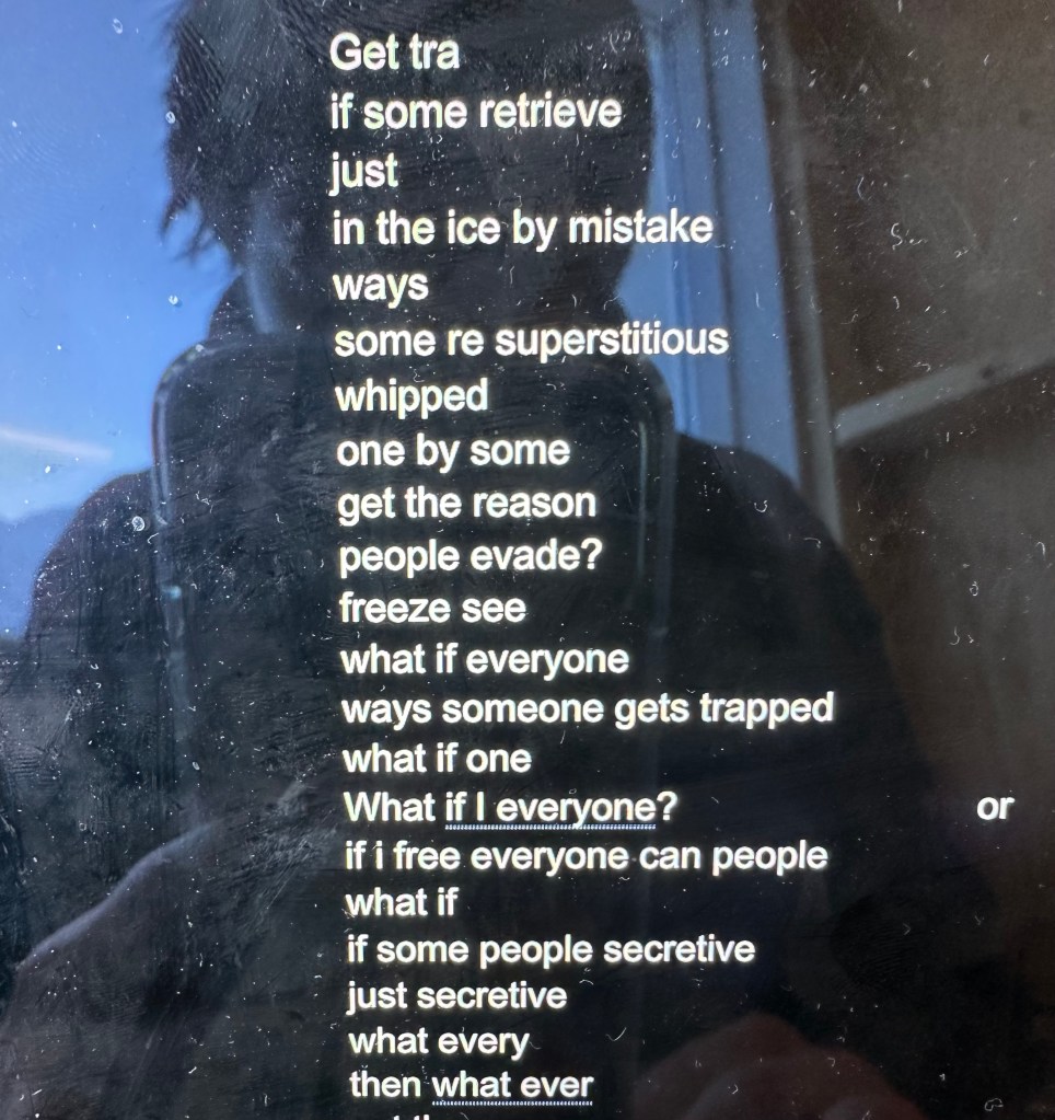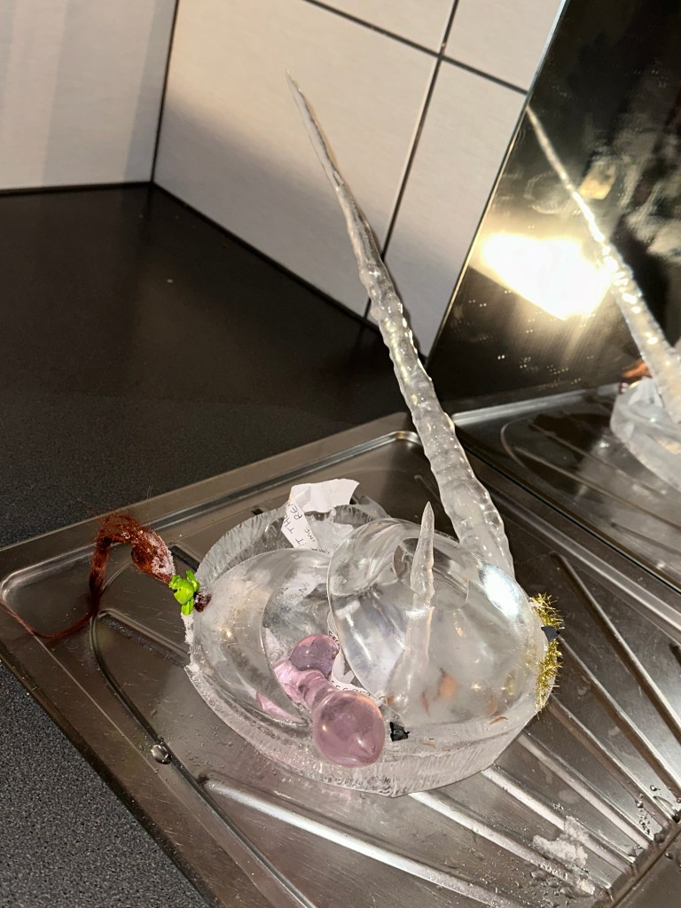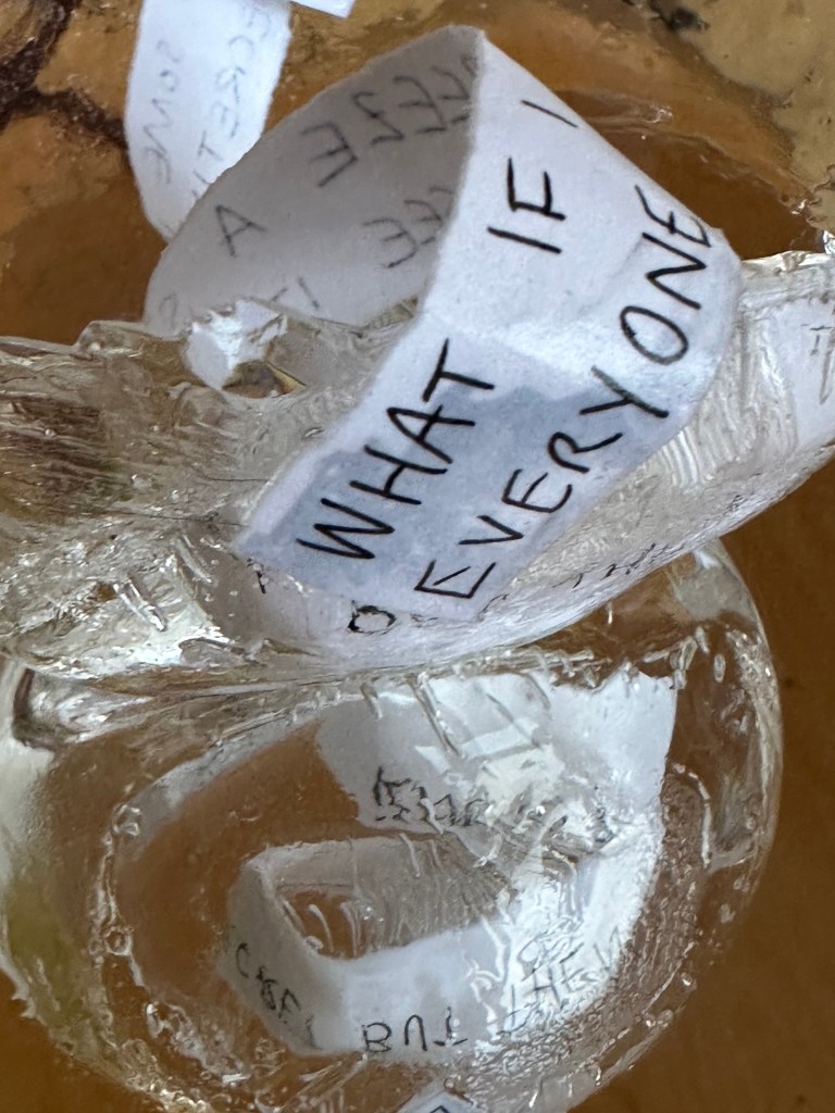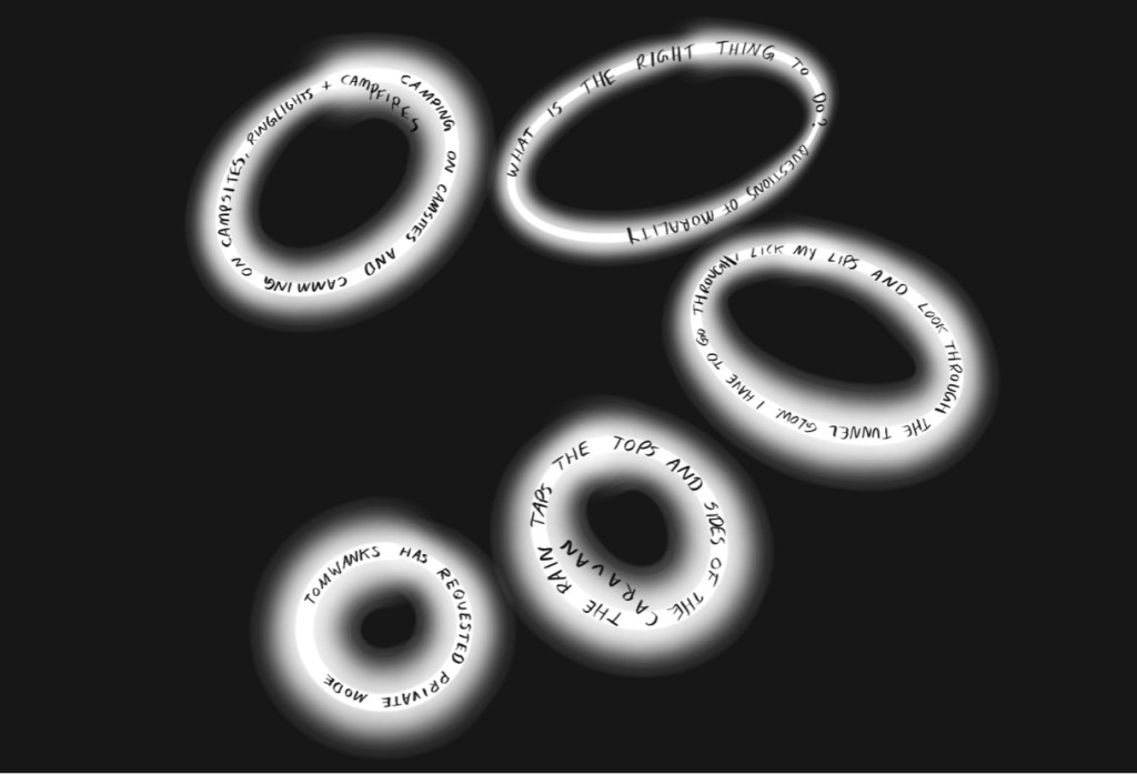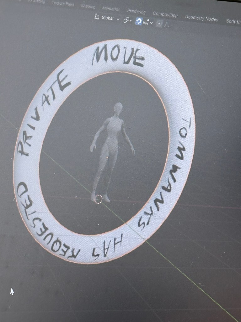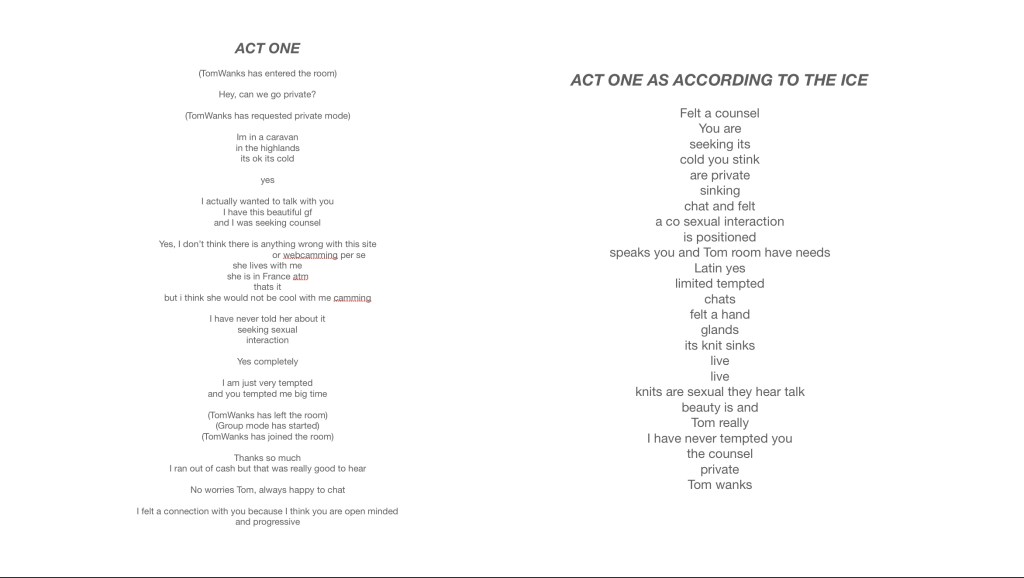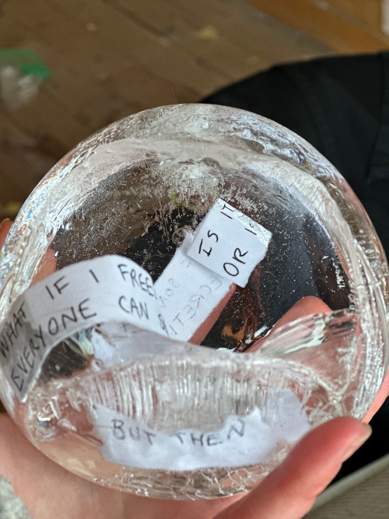 I collected text from an online interaction with a client (I am a sex worker and webcam model), using it as a starting point to write a short play. After taking it through the ice sculpture process I then used Blender to translate the reconfigured play into an interactive digital environment. The forms in the environment were inspired by my ring light, with handwritten text wrapping around the digital rings to mimic the way the ice moves the slips of paper. The audience would pass through the ‘ring lights’ after jumping off a slippery ice disc. Whilst they were navigating the screen, I read the play via video call as the original text had come from a video call. I am currently thinking about ways in which these sculptural pieces, both ice and digital, could also become costume – and to introduce my body into the process further.
