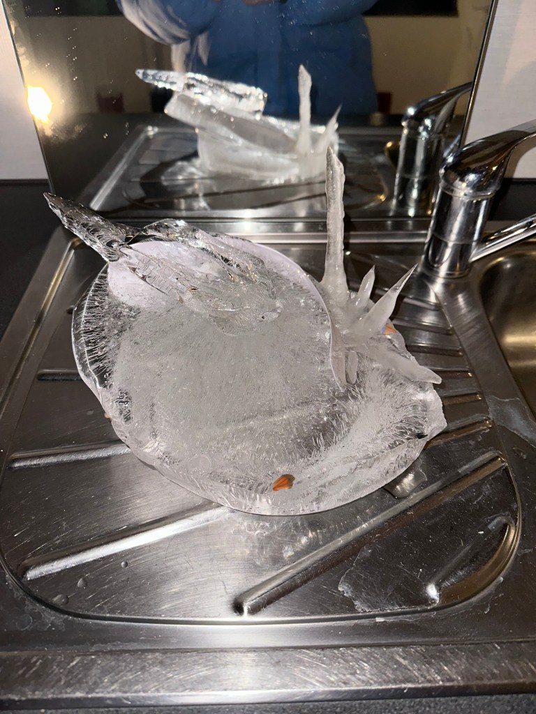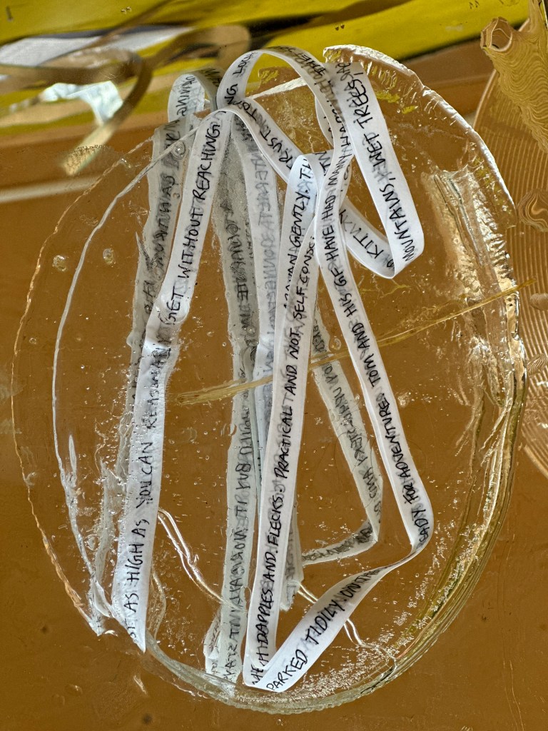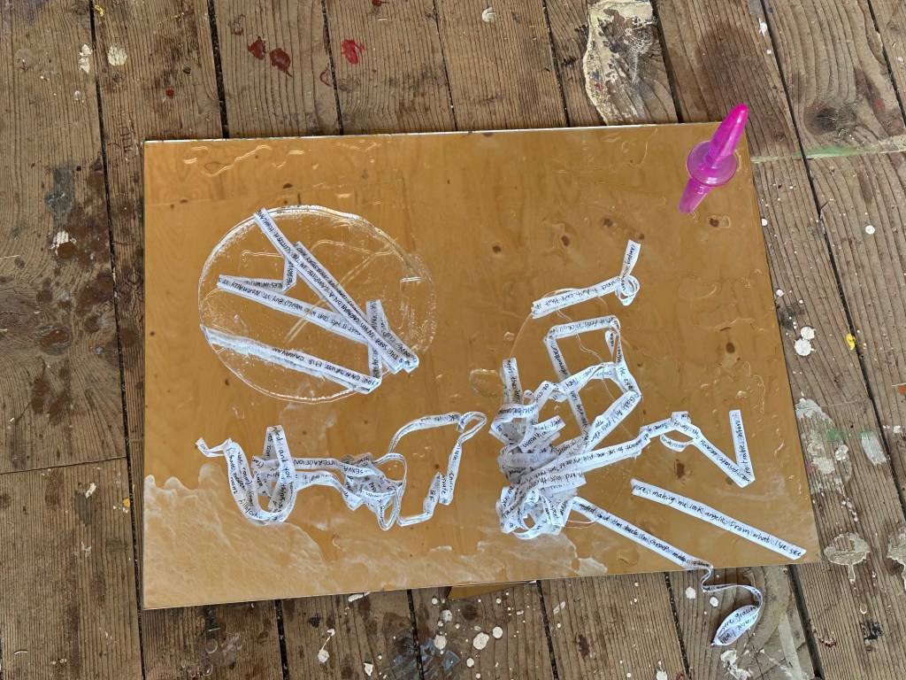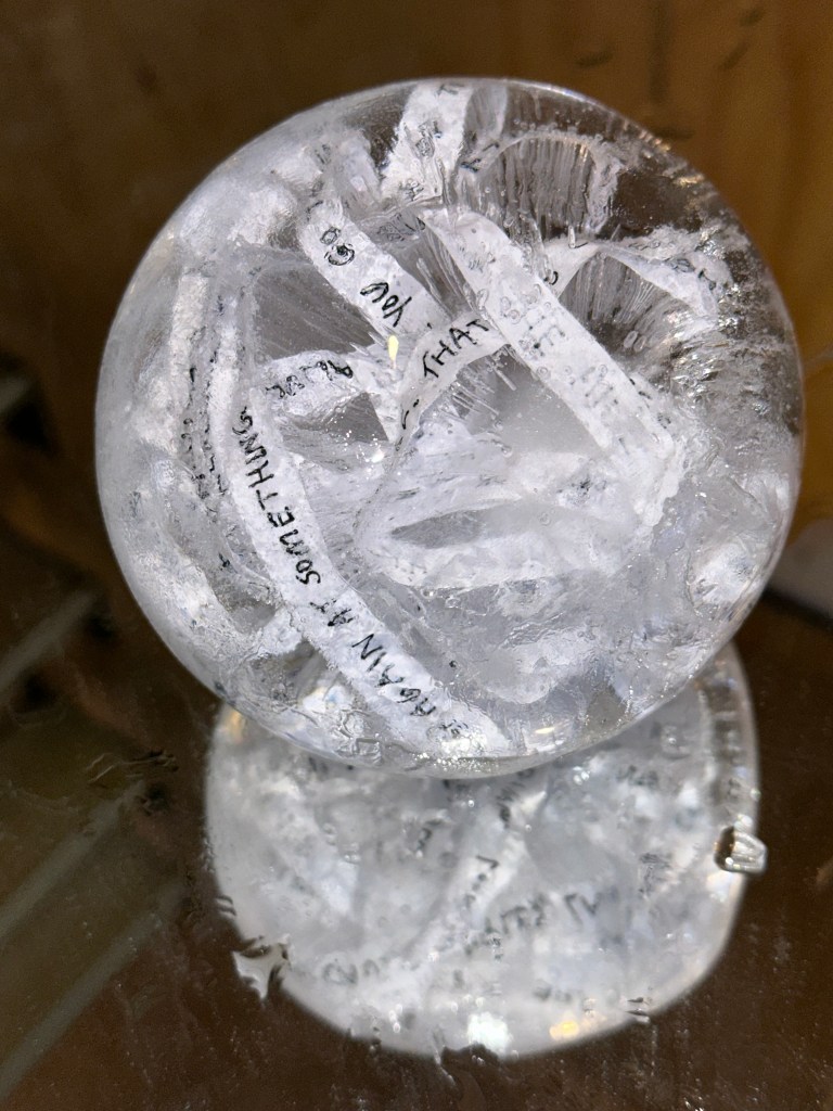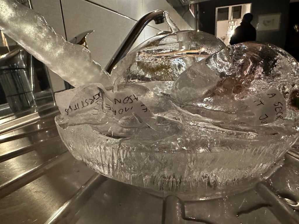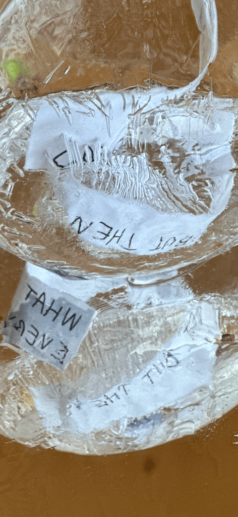 During my time in Iceland, I have been learning more about the intuitive sides of my process as well as developing my writing, and the way it intersects with spatial or performance practices. I began working with ice as a sculptural medium: using a similar kind of entangled approach, I wrote text onto long strips of paper and put them in various shaped containers of water to freeze them outside, into sculptural forms. I would then pause and repeat the process, taking the ice inside, melting them together briefly, then freezing them outside again. The frozen sculptures distort and mangle the text, which I then read and re-capture; continuing the feedback motif.